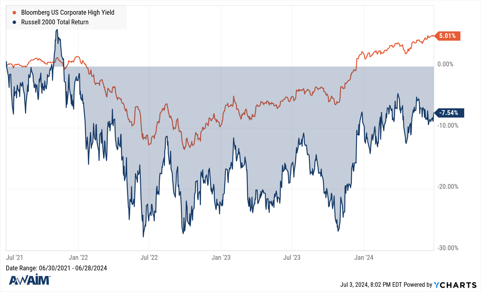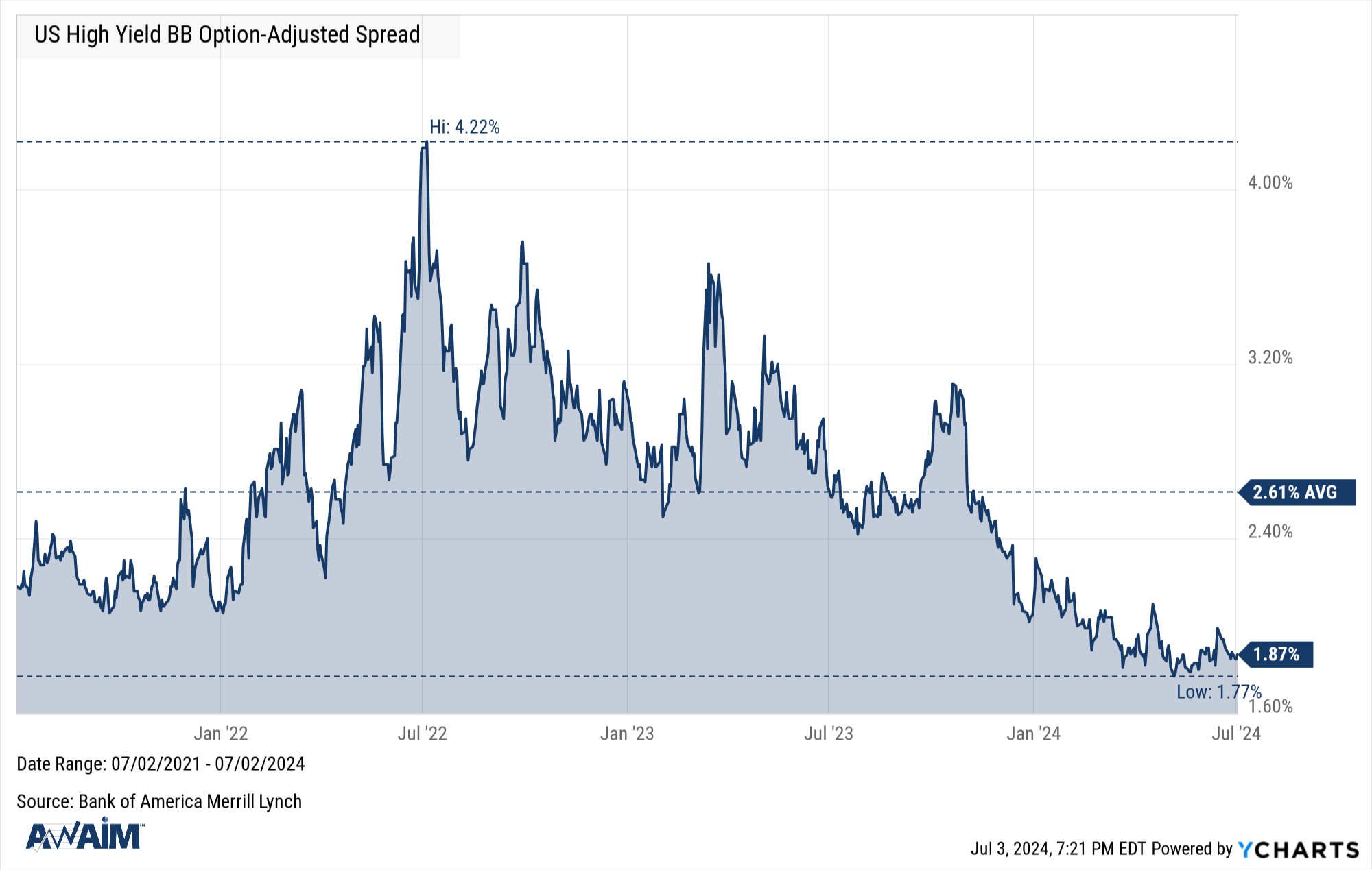 The Earnings Yield on the Russell 2000 Index hovering at 6.95% (as of 07/05/2024), while the Effective Yield on BB-rated Corporate Bonds at 6.33%. Meanwhile, the option-adjusted spread (OAS) on BB bonds is around 187 bps, well below the longer-term average of 261 bps (see below). Be on the lookout for our CIO's upcoming article in Forbes that expounds on the narrative associated with these lower-credit rated stock and bond market dynamics.
