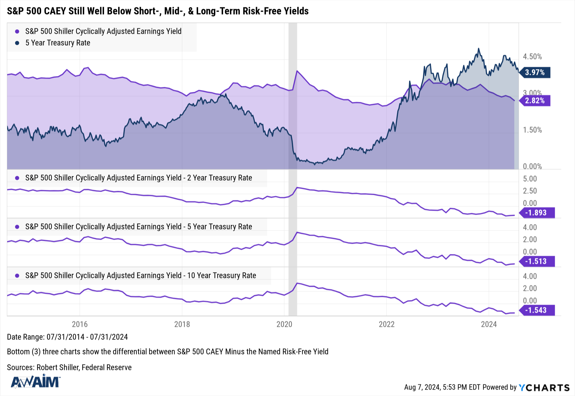 In Figure 1 (below), the differential relationships between the S&P 500 CAEY and three main risk-free rates in the U.S. are illustrated for the ten-year period ending July 31, 2024. Additionally, the main section of the chart shows the raw data series focusing in on just one risk-free rate (e.g., 5-Year U.S. Treasury) versus the S&P 500 CAEY. The basic premise is that when risk-free rates are offering better cash flows (or, yields) than the cash flows offered by stocks (whether those cash flows are paid out in the form of dividends or not is not analyzed here), a rational investor would choose to allocate more towards the risk-free rate to benefit from more favorable returns per unit of risk. (U.S. Treasuries are assumed to be risk-free by capital market participants [although this point is hotly debated elsewhere]).
