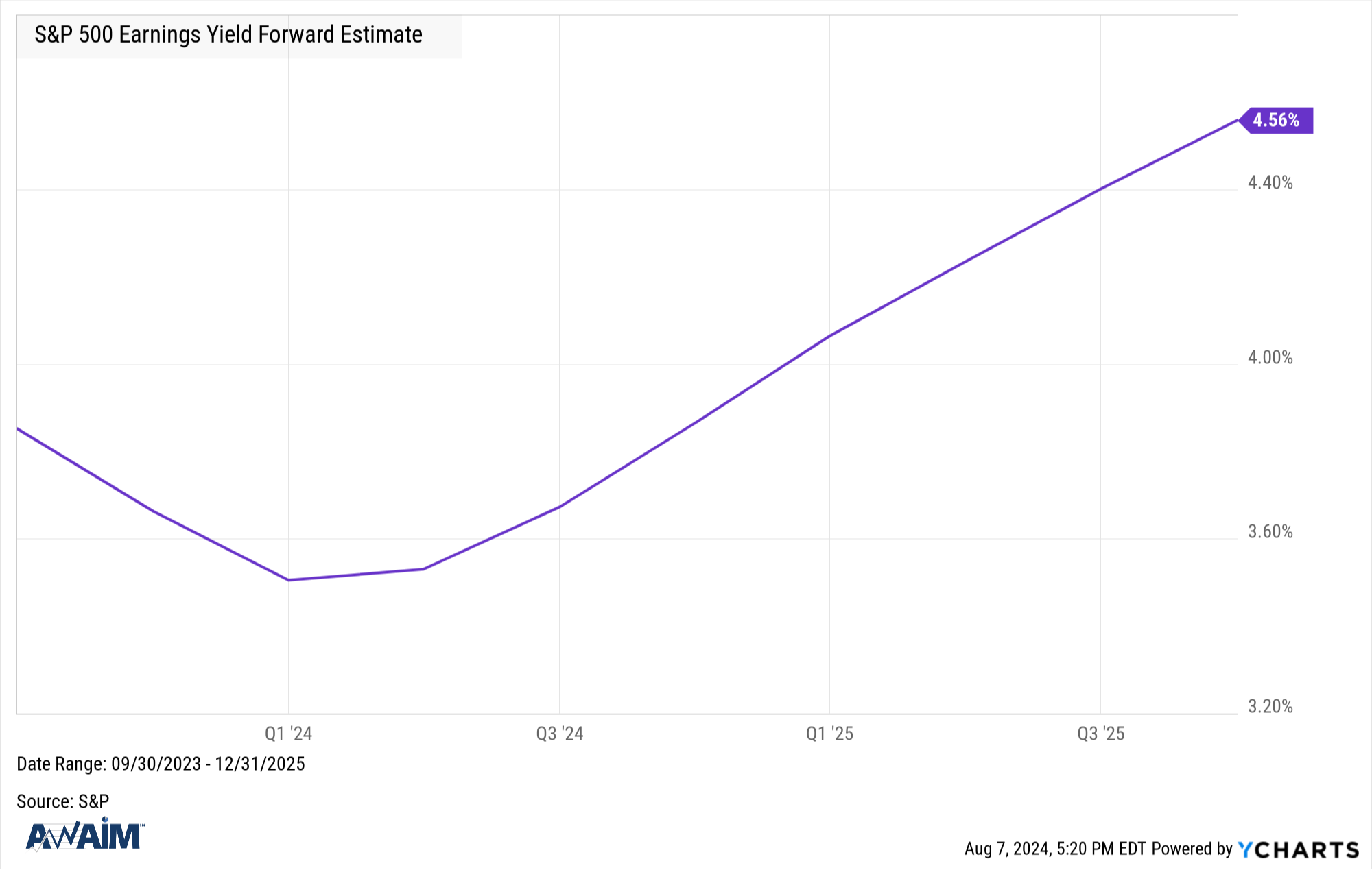 In Figure 2, another version of the S&P 500 Earnings Yield is shown, which represents the forward estimate of this metric and non-cyclically adjusted (as is the case of the Shiller Cyclically Adjusted Earnings Yield). We prefer referencing Shiller's CAEY in formulating our market outlook as it averages out earnings over the prior ten years on a rolling basis, thereby reducing short-term events, shocks, and accounting adjustments. That being said, the Forward Estimate on the S&P 500 Earnings Yield (below) shows a significant increase between now and year-end 2025, when the value is projected to be at 4.56%. It is assumed that stock price levels remain constant while earnings are projected to increase, which results in a growing metric. However, we do know that this Earnings Yield level could also grow to such a lofty figure through a falling denominator (P) while its numerator (E) remains unchanged. We make no judgement on how the attainment of a more favorable yield is attained. But as rational investors, we would allocate accordingly.